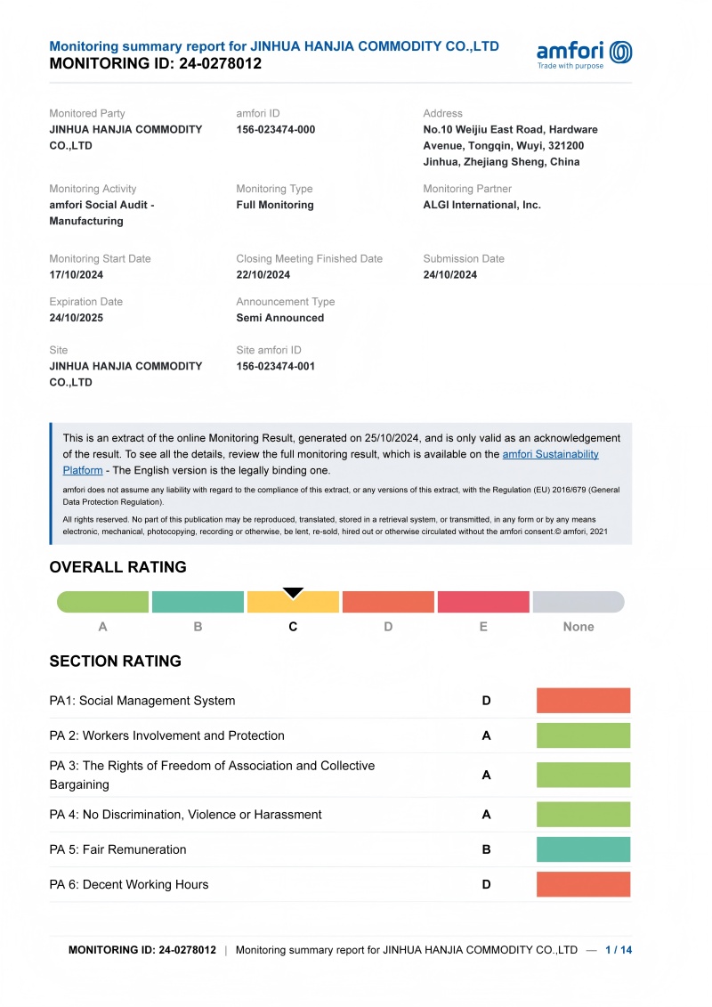 Vào tháng 7 năm 2025,Công ty TNHH Jinhua Hanjia Hàng hóa, Ltd.Đã đạt được thành công một chứng nhận cấp C trong Chương trình kiểm toán nhà máy theo phân loại quốc tế (ICS), được thực hiện bởi Cơ quan Thanh tra Châu Âu của bên thứ ba do Liên minh Hợp tác xã được bổ nhiệm. Hệ thống chứng nhận này bao gồm bốn tầng: A, B, C và D. Là thành viên của Phòng Thương mại và Công nghiệp Pháp (FCD), công ty tuân thủ chương trình quản lý xã hội của tổ chức lao động quốc tế tiêu chuẩn SA8000, thực hiện kiểm toán trách nhiệm xã hội đối với các nhà cung cấp.