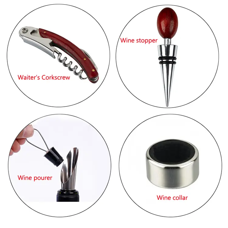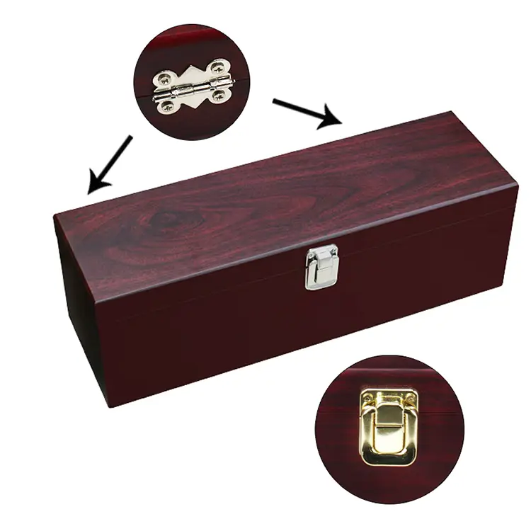 Có ba bộ phận kim loại trên hộp, chốt đảo ngược phía trước và bản lề ở phía sau. Các bộ phận kim loại này có sẵn trong các kiểu và màu sắc khác nhau để tùy chỉnh và hộp có thể được tùy chỉnh dựa trên cơ chế mở của nó. Sau khi mở nắp, có các công cụ rượu vang 4pcs với Eva được đặt một cách ẩn trong hộp. Những phụ kiện này được làm bằng thép không gỉ hoặc hợp kim kẽm, với hai trong số chúng kết hợp gỗ hồng sắc màu đỏ tự nhiên, tạo ra sự cân bằng hài hòa với hộp gỗ.
